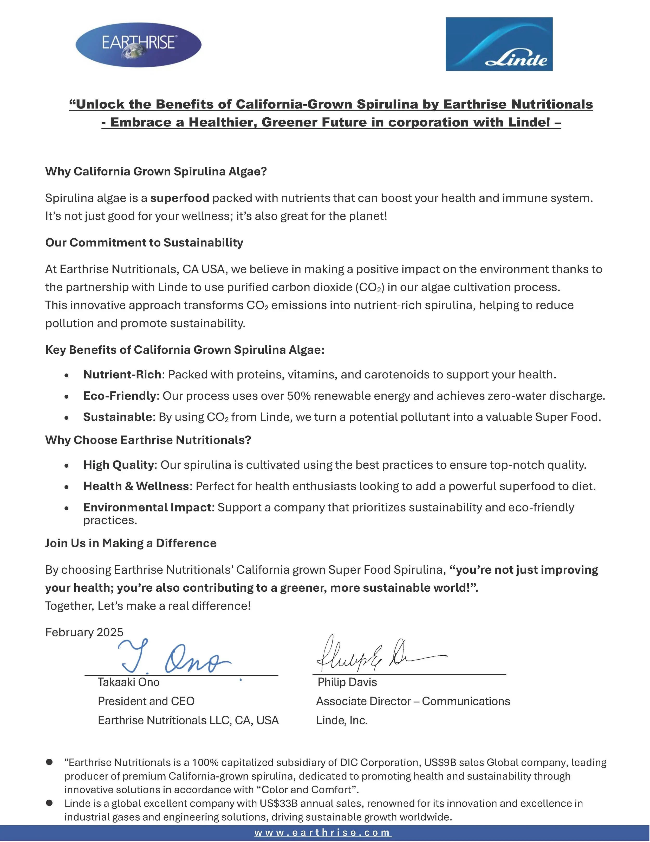 Earthrise Nutritionals partners with LINDE to promote sustainable agriculture by using purified CO₂ in spirulina cultivation, which is in line with our policy in addition to zero-water discharge and over 50% of renewable energy usage.